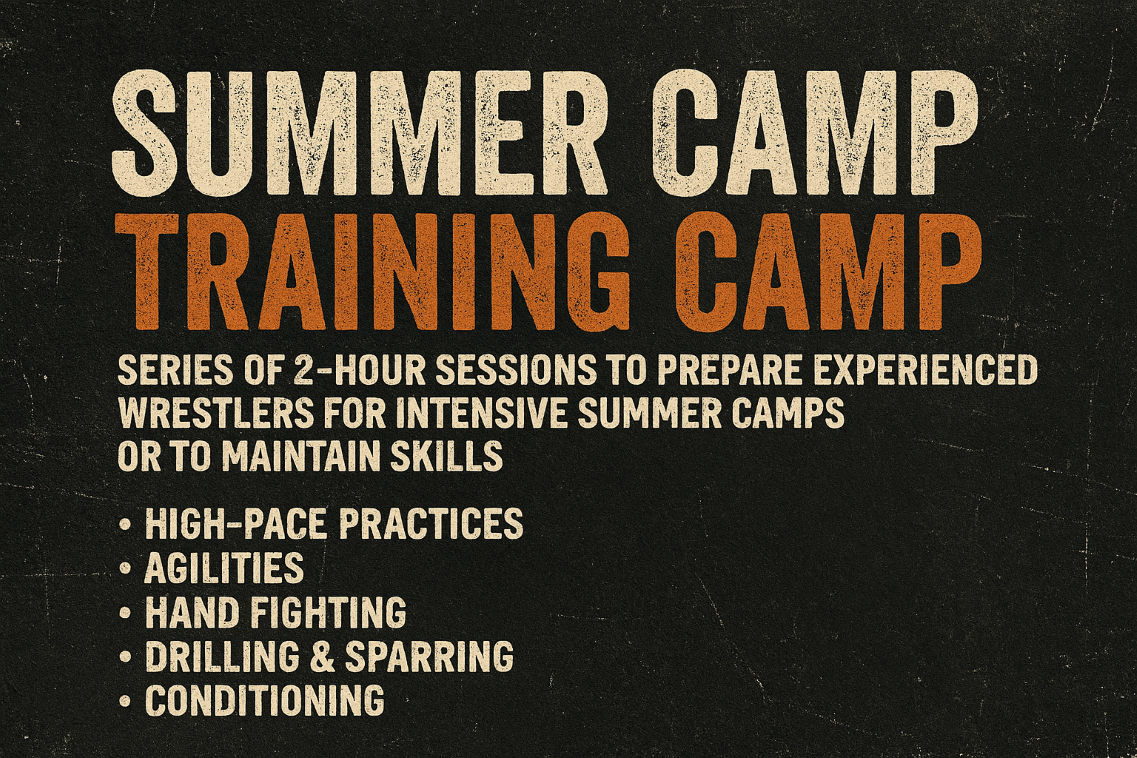 The Summer Camp Training Camp is a series of 2-hour sessions designed to prepare experienced wrestlers for a summer full of 30-man camps, team camps, or technique camps. Wrestlers will train daily at high pace similar to an in-season practice. Workouts will consist of agilities, progressive warm-up, hand fighting and upper body movements, quick drilling through specified technique, open play-style sparring, live wrestling, and wrestling styled conditioning sessions. This camp is designed for wrestlers planning to attend more intensive camps in the summer, but is also perfect for wrestlers just trying to maintain during the summer.